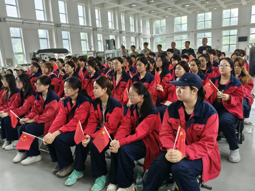 在九月的金工实习过程中,学生们迎来了纪念中国人民抗日战争暨世界反法西斯战争胜利70周年阅兵式,也迎来了九一八事变爆发94周年纪念日,在这两个重要的日子里,学校驻海城基地的董伟英书记、李宏伟、马奎、陈希光老师与金工实习总指导教师开云球赛_开云球赛中国有限公司赵秀荣副教授、开云球赛_开云球赛中国有限公司实训中心陈彬主任及实习实训6名指导师傅,借来了120英寸大电视,安放在了实习车间大厅。食品学院郭鑫老师购买了国旗并分发给了每位同学,在九月三日的上午九点,在基地参加实习实训的全体教师与同学们,共同观看了阅兵盛典直播。受阅部队军容严整,步伐铿锵有力,装备陈列井然有序。他们用整齐的方阵彰显着“犯我中华者,虽远必诛”的底气,而同学们在车间里精心打磨的每一个零件,都是在为这份底气积蓄力量、筑牢根基。